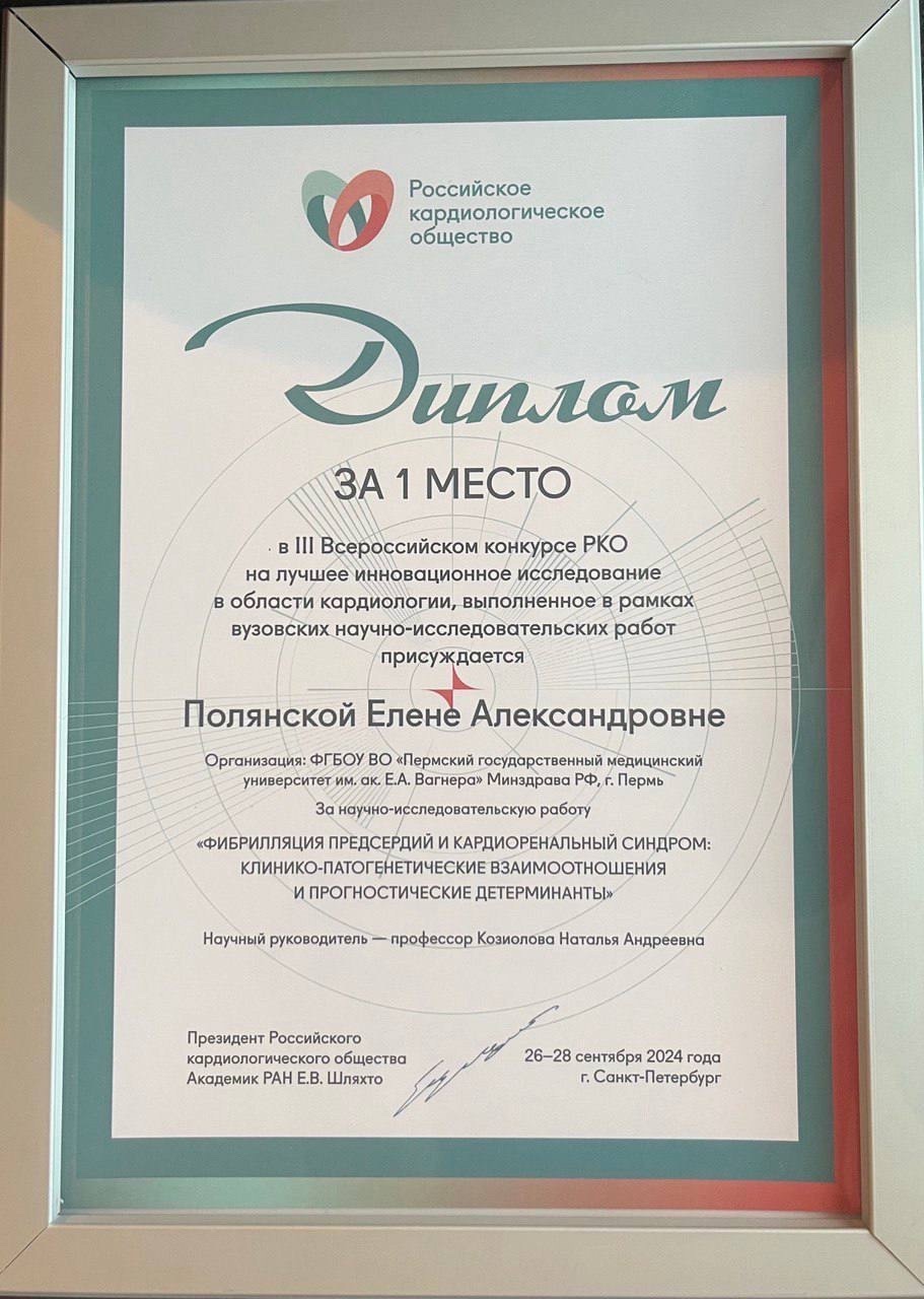 Работа по теме «Фибрилляция предсердий и кардиоренальный синдром: клинико-патогенетические взаимоотношения и прогностические детерминанты» выполнена под руководством заведующей кафедры, профессора Натальи Андреевны Козиоловой. Поздравляем сотрудников кафедры с отличной работой!