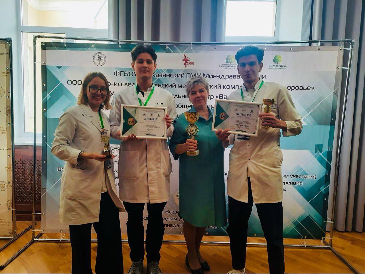 Наша команда стала победителем в сложном конкурсе «Что? и Где?», посвященном топической диагностике заболеваний нервной системы. Капитан команды Бижитуев Али-Паша победил в номинации «Практические навыки». В этом заслуга профессора кафедры неврологии и медицинской генетики, доктора медицинских наук Селяниной Наталии Васильевна, которая в течение месяца усердно тренировала команду и сопровождала их в Казань.